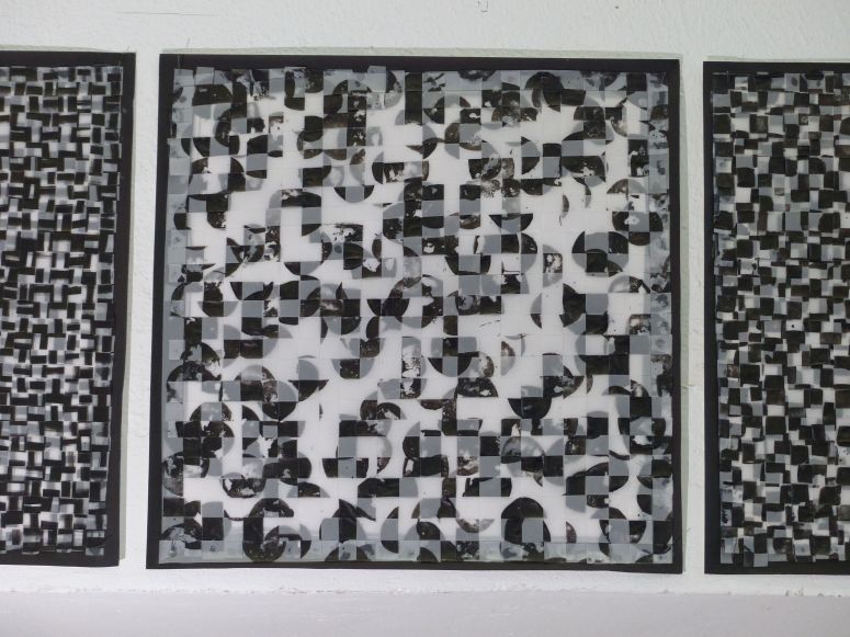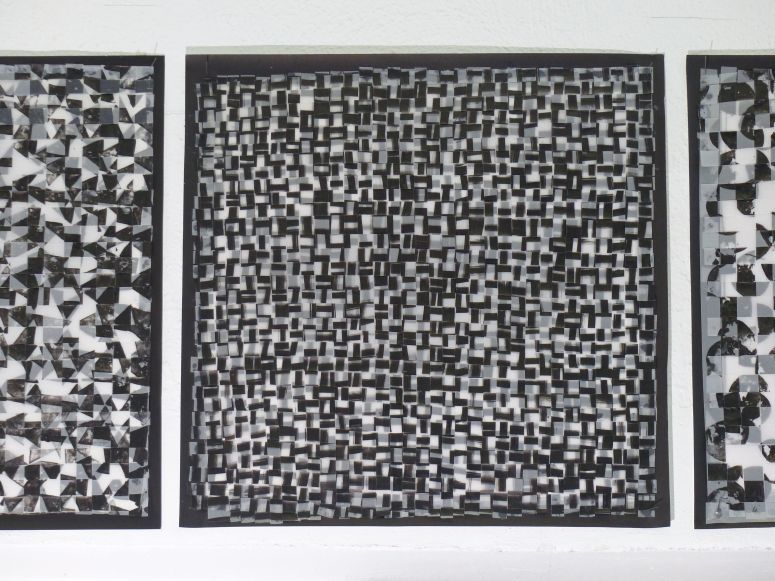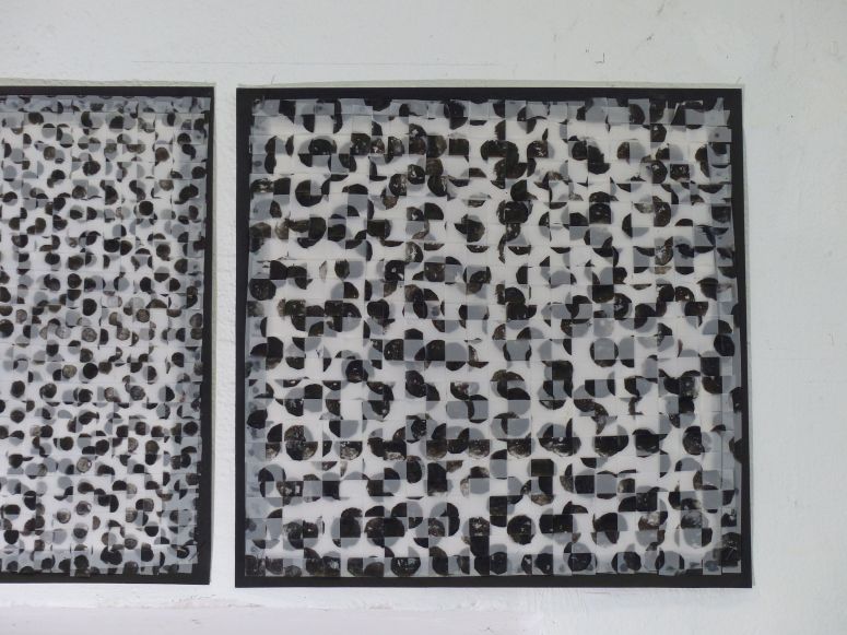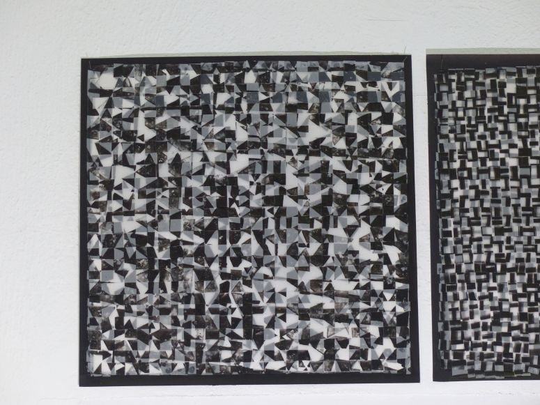 „gewebt“stammt von 2014. Geometrische Muster stempeln auf Transparentpapier, das entstandene Bild in Streifen zerschneiden, alles gut mischen, dann die Streifen neu zusammenweben, fertig ist ein neues Muster, das sich durch den Zufall malt.