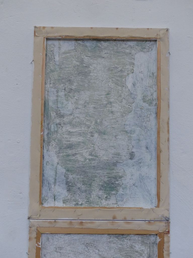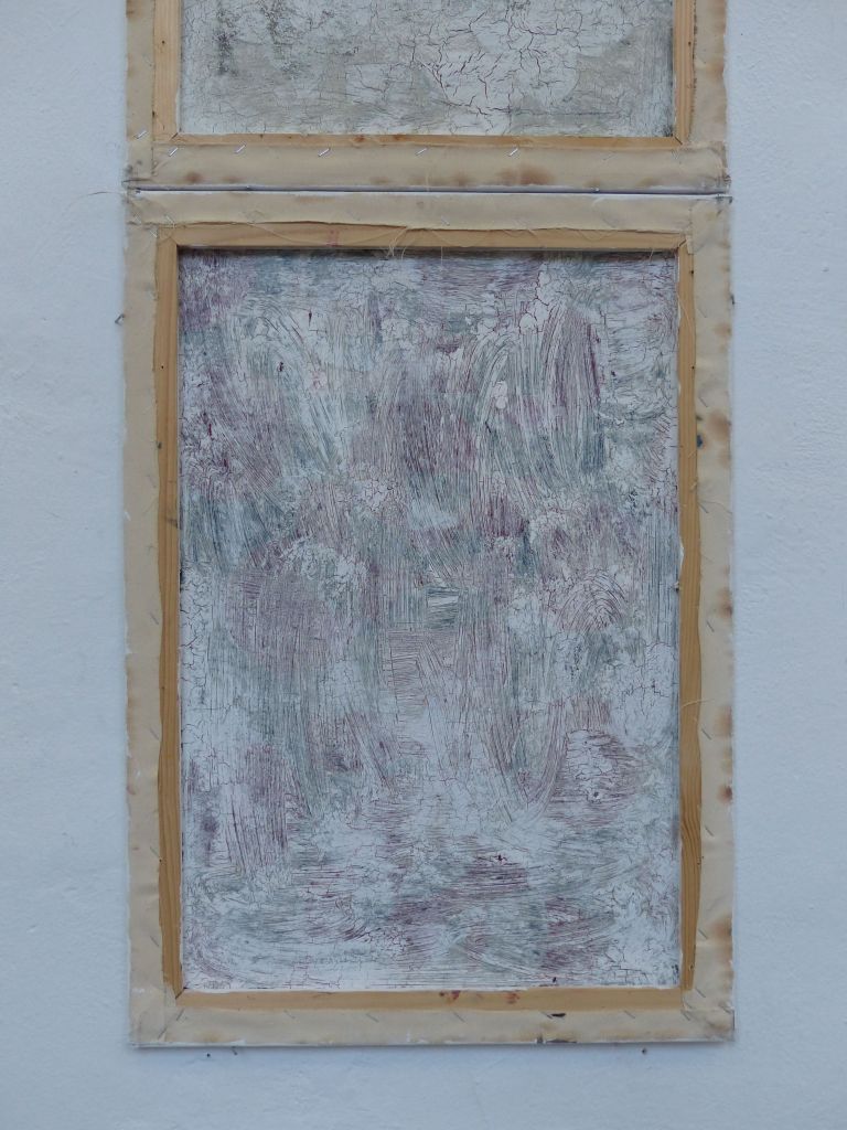 „Hinten“ heißt diese kleine Serie von Leinwänden. Ich wollte alte Arbeiten, die ich nicht mehr mochte und die mit Öl auf Leinwand gemalt waren, wieder verwenden, spannte die Leinwände vom Rahmen ab, dreht sie um und übermalte die nun auf der Rückseite befindlichen ehemaligen Bilder in schnellen Strichen und ohne jegliche gestalterische Absicht mit weißer Acrylfarbe, stellte sie dann zum Trocknen im Atelier auf die Seite. Am nächsten Tag kam ich ins Atelier, sah sie in diesem Rohzustand wieder und fand : „Whow. Fertig ! Da brauchste nix mehr dran machen.“ Sowohl die komplette Nichtabsicht von Gestaltung als auch das Eigenleben des Materials – die Acrylfarbe „reißt“ so herrlich auf dem Leinöluntergrund – ließen Bilder entstehen, die ich zwar gemacht habe, für die ich aber nichts kann. Wer hat hier gezeichnet beziehungsweise gemalt ?