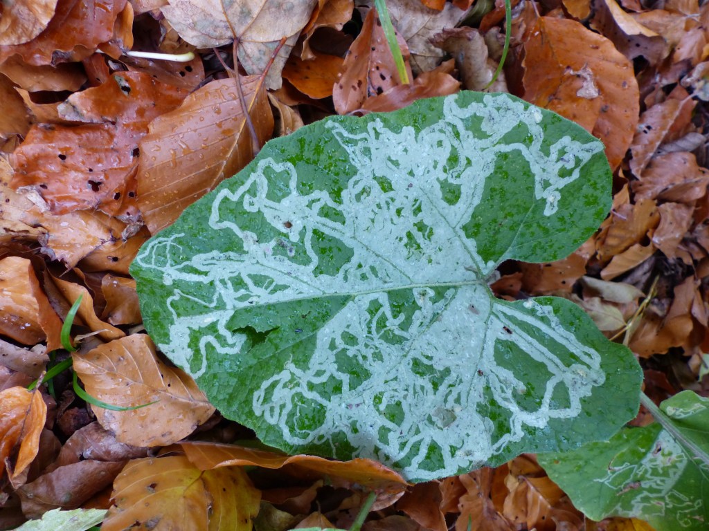 Die kleinen Fotos zeigen „Minen“. Das sind die Spuren und Zeichnungen, die Schmetterlingsraupen hinterlassen, wenn sie sich nach dem Schlupf aus dem Ei durch die Epidermis, also die oberste Schicht von Blättern fressen. Die Autorenschaft ist hier klar, es sind die Raupen, denen der Beifall für diese hochästhetischen Gebilde gebührt.