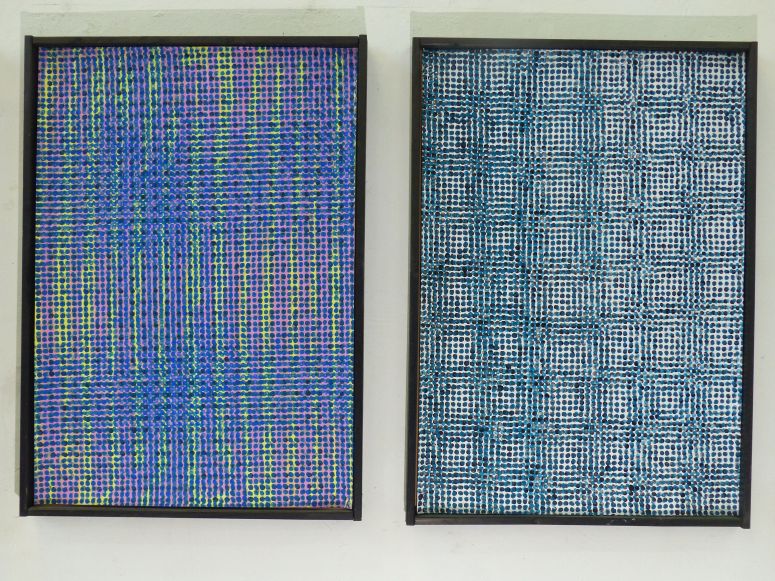 Die Serie „Moiré“ stammt von 2014. Der „Moiré-Effekt “ ist laut wikipedia „ein optischer Effekt, bei dem durch Überlagerung von regelmäßigen Rastern ein wiederum periodisches Raster entsteht, das spezielle Strukturen aufweist, die in keinem der Einzel-Muster vorhanden sind.“ Ihr kennt sicher Hasendraht-Gitter. Ich habe es auf das Papier gelegt, durch die Gitterlöcher Farbflecke mit den Fingern draufgetupft, das Gitter in einem bestimmten Winkel gedreht, wieder getupft, wieder gedreht … und es entstanden diese „speziellen Strukturen“ – ganz wie von selbst. Ich habe sie nicht gezeichnet, ich habe nur Punkte getupft.