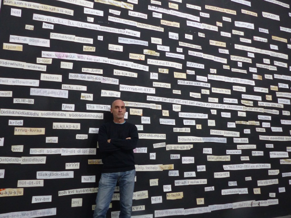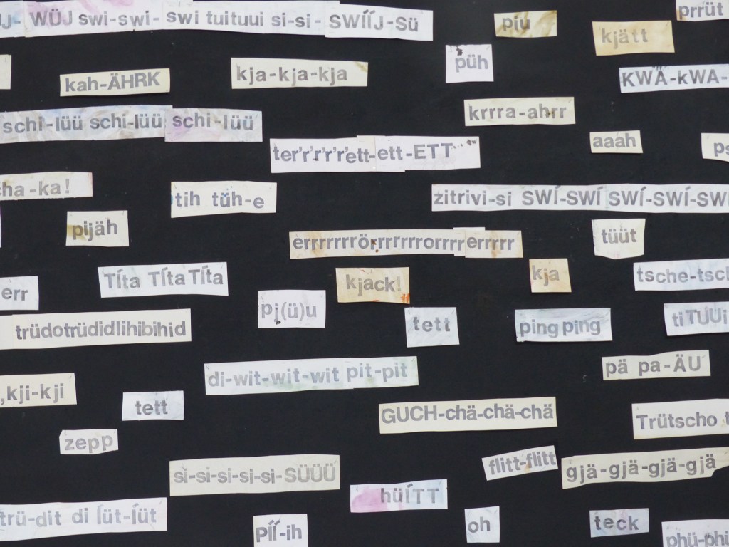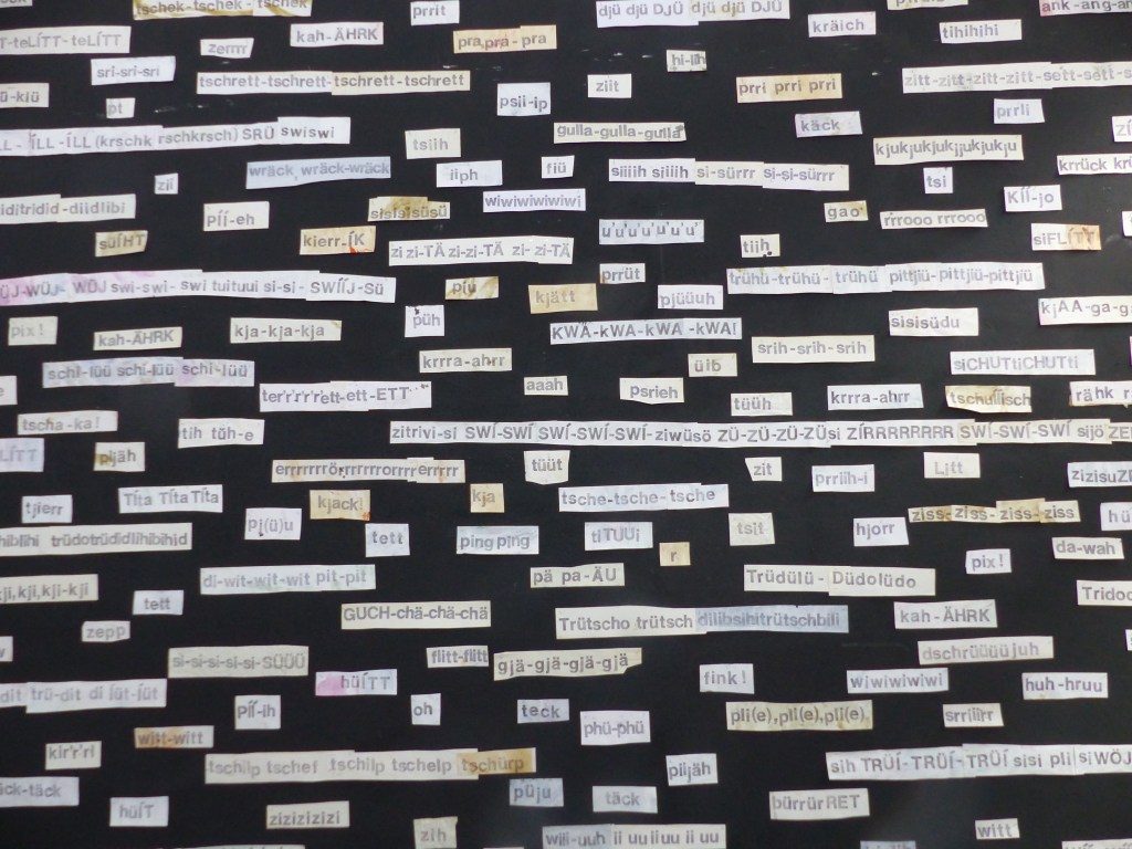 „Vögel“ heißt die Installation draußen im Vorraum der Peripherie. Ich habe aus einem Buch, einem Vogelführer, die dort sprachlich nachgeahmten Laute von Vögeln abgeschrieben bzw. „abgestempelt“. Dabei habe ich nur die Stimmen von Vögeln genommen, die ich selbst schon in Baden-Württemberg gesehen habe. Vogelstimmen. An sich schon eine vergängliche akustische Zeichnung in der Luft. Auch jedesmal, wenn morgens gehört, eine Zeichnung in meinem, in eurem Kopf. Wer zeichnet hier ? Ich hoffe, in eurem Gesicht kann dieser absurde Ansatz, Vogeltöne sprachlich zu benennen, ein Lächeln zeichnen und in eurem Kopf zeichnet ihr selbst ein Vogelkonzert wie an einem Frühlingsmorgen.